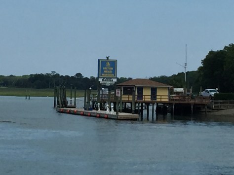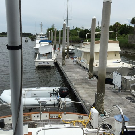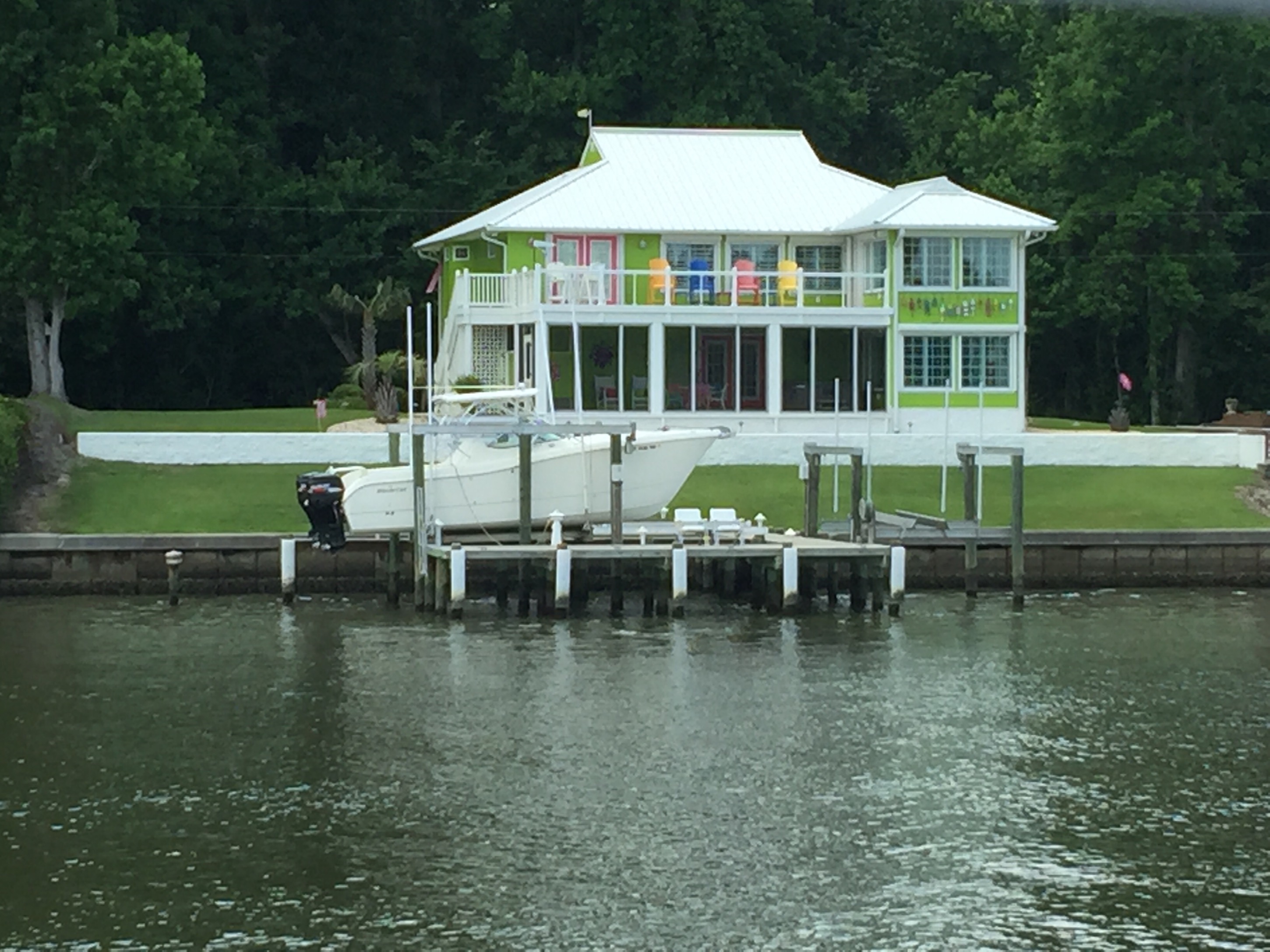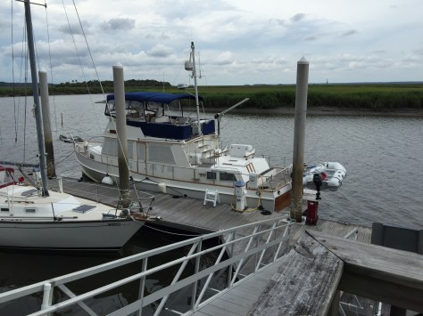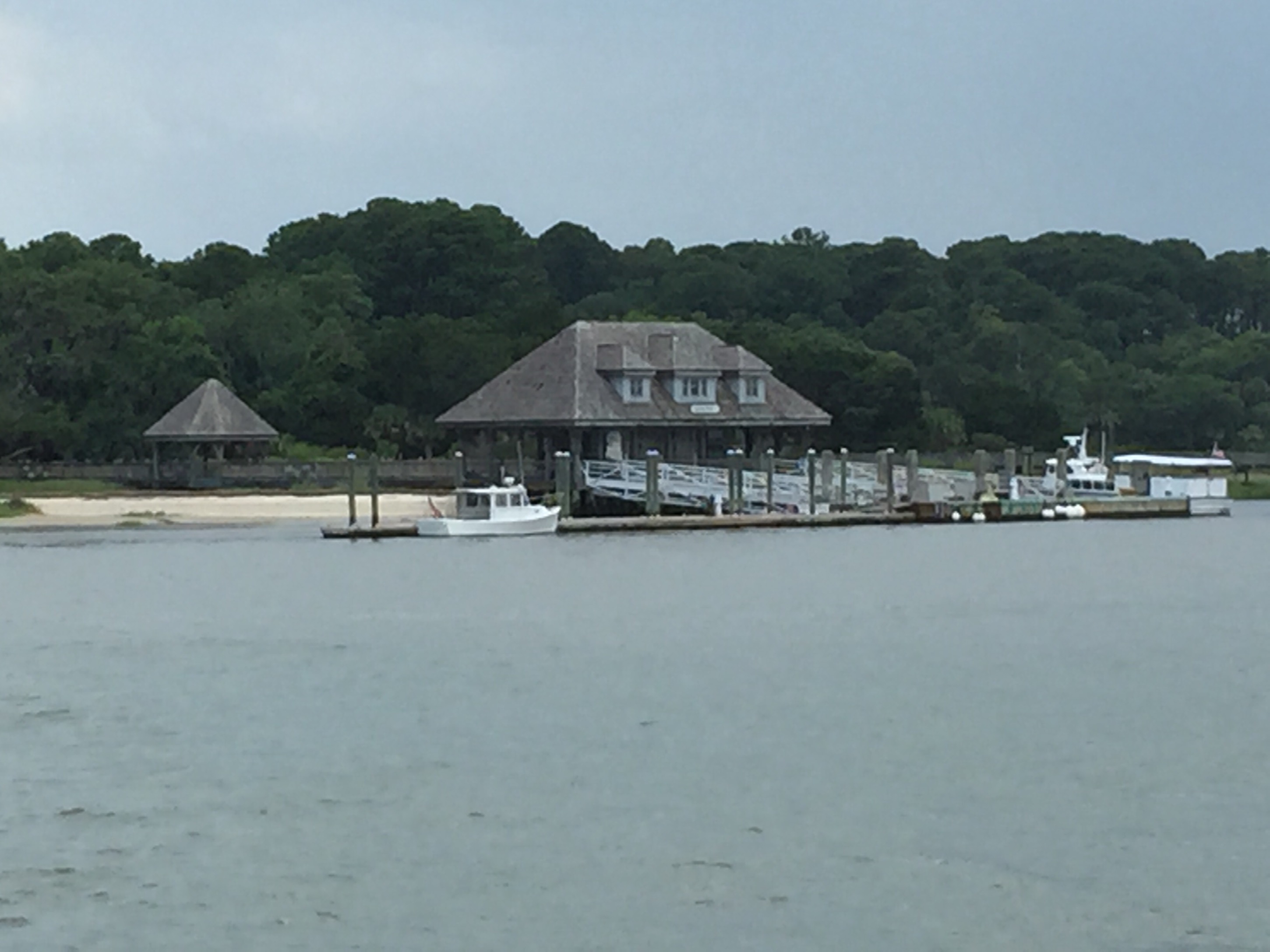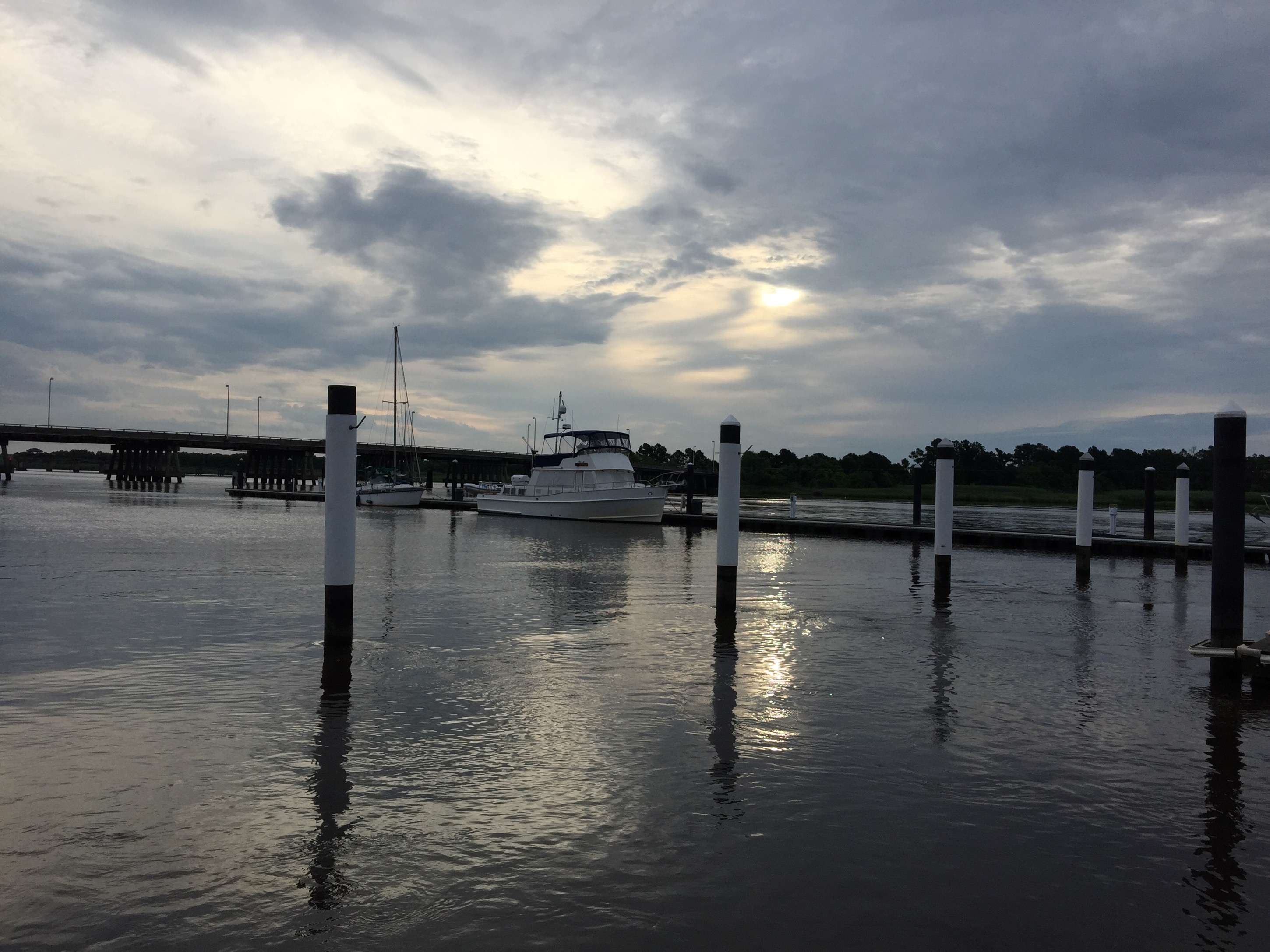 We passed byThe Marine basic training compound Parris Island. We commented on how hot it was and how hard it would be for basic training during today’s weather. We approached Beaufort sc with dark thunderstorms looming and again had to race to beat the storm.this time we were not totally lucky being able to tie up in dry weather. There was lightning thunder and the beginning of rain as we tied up and winds were strong however different people from adjoining boats raced  to help us tie up and we watch the rest of the storm safely from our cabin. After walking to town when the rains ceased we found a great restaurant called Q and enjoy a wonderful dinner of brisket barbecue and blackened shrimp. The southern green beans are to die for!