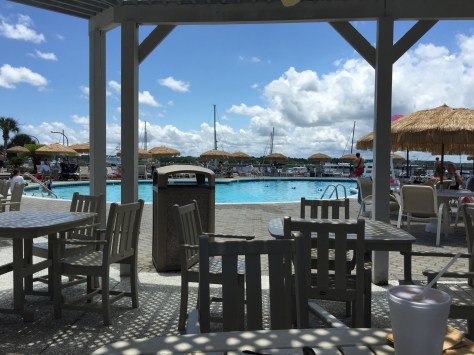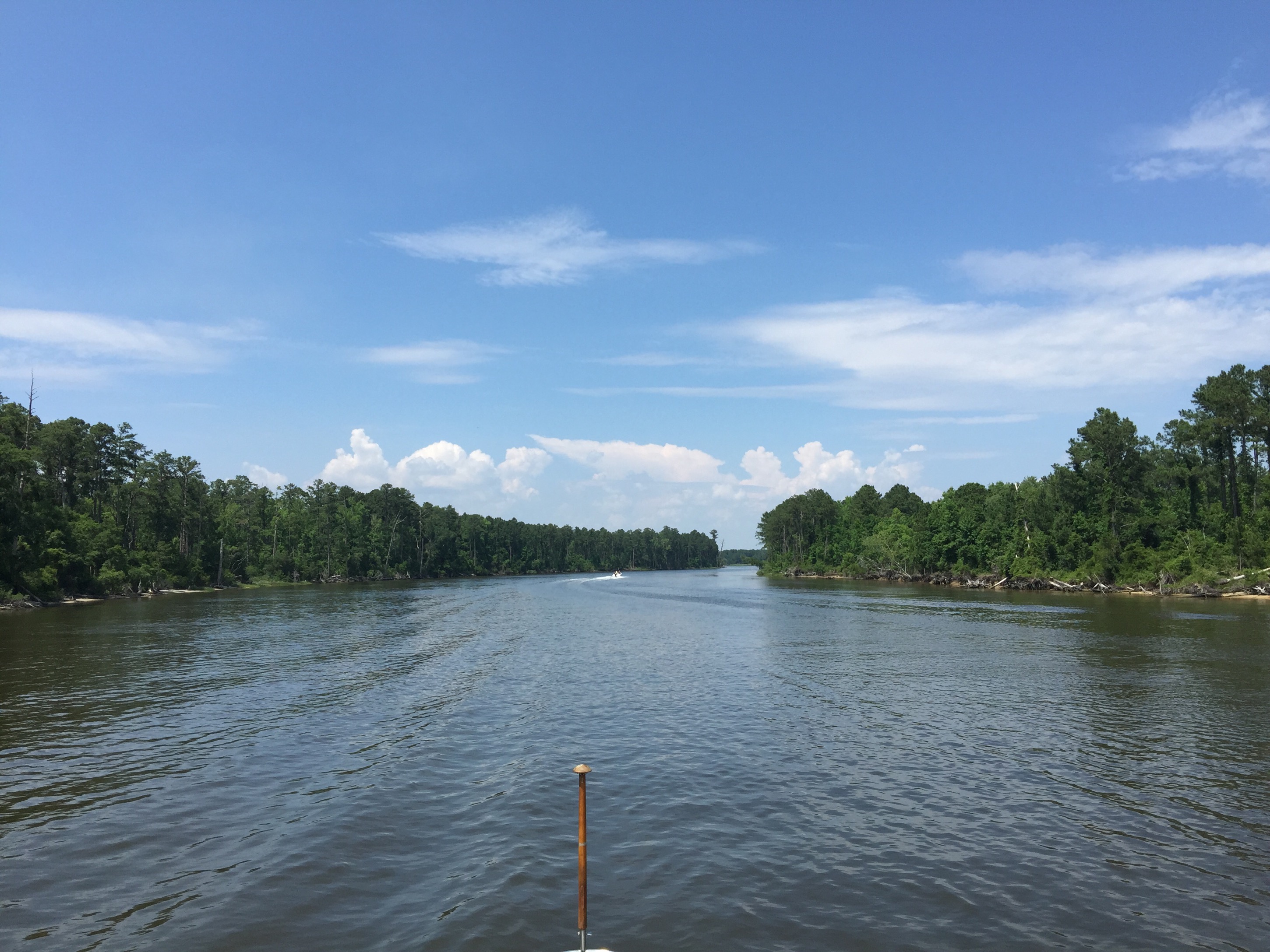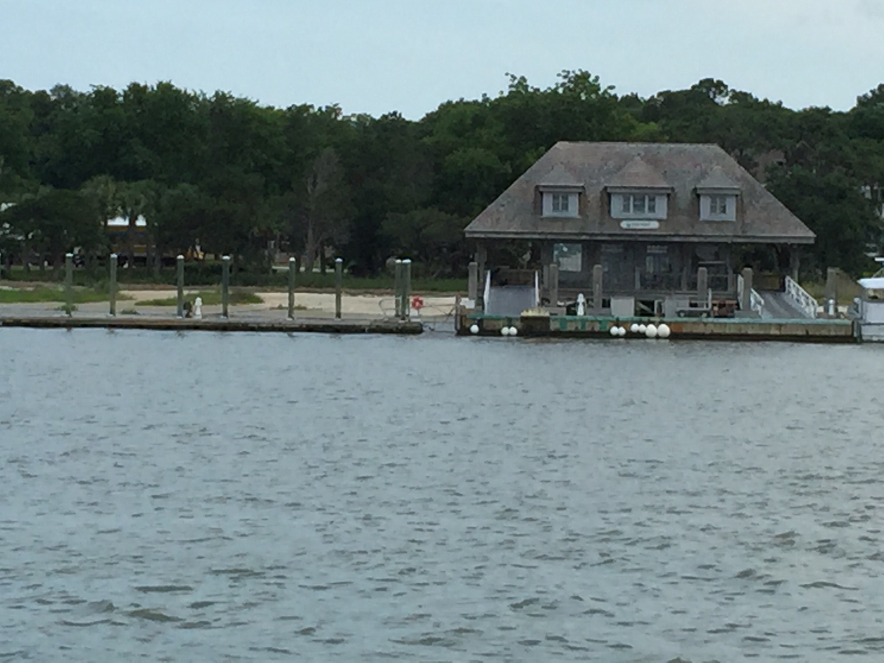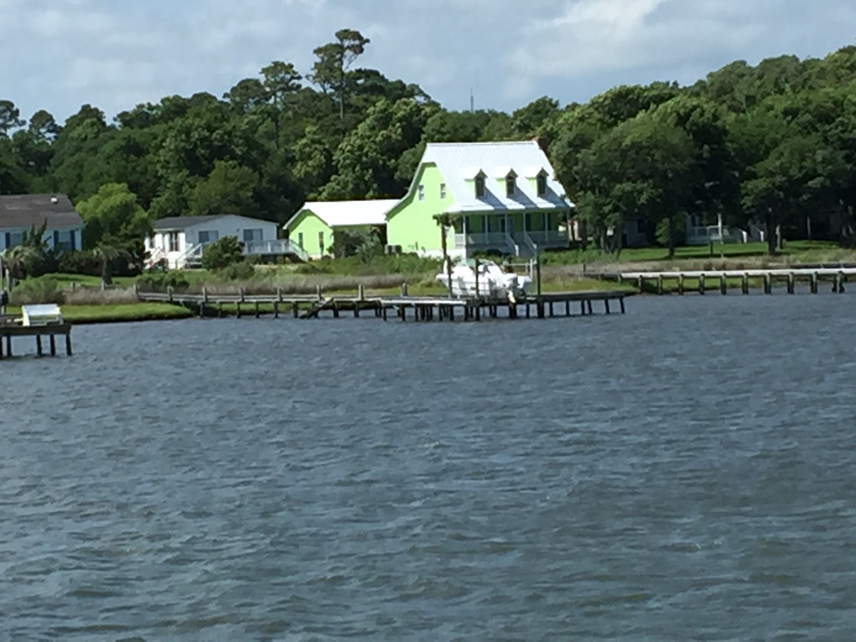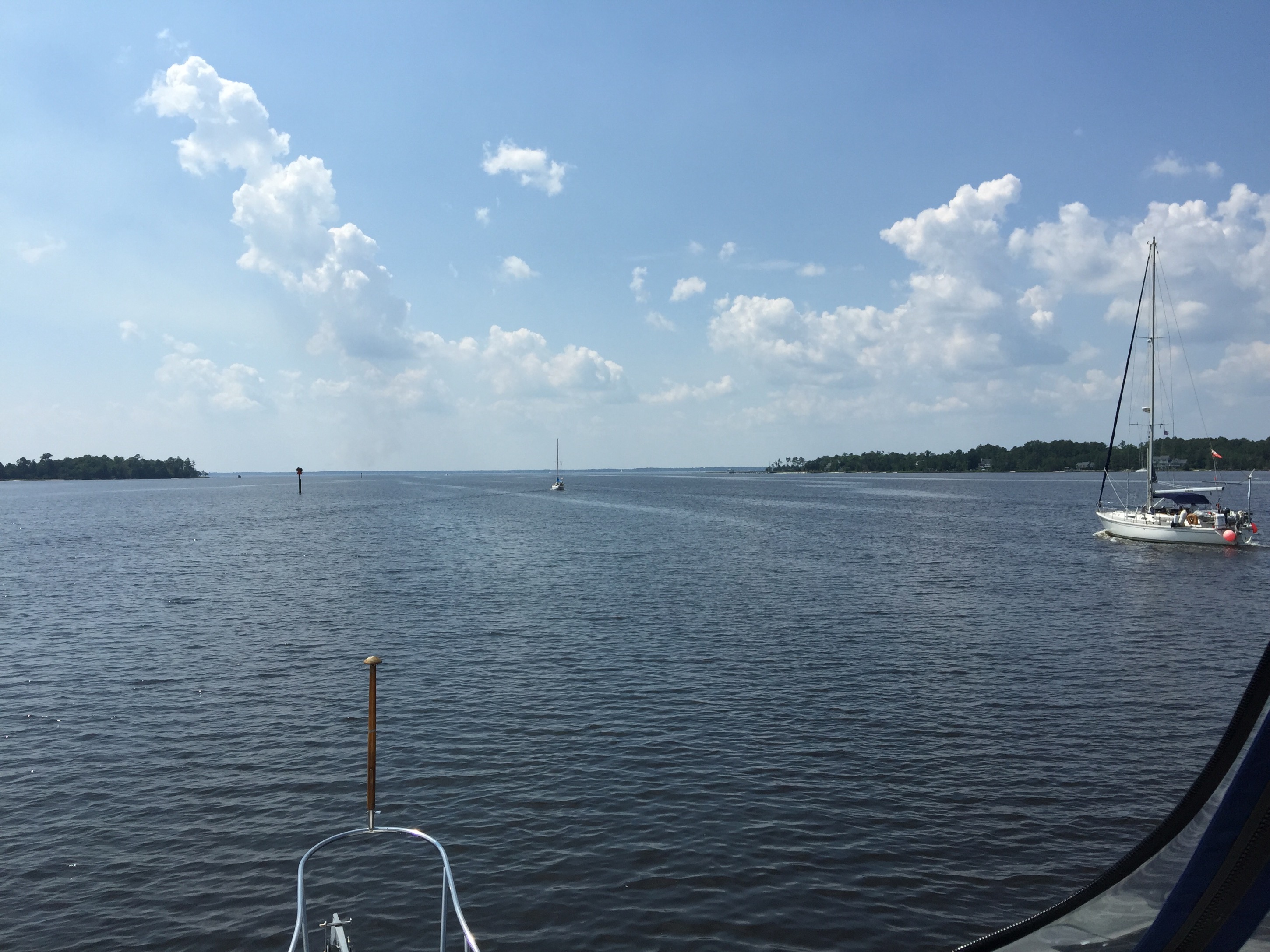 We made it to Oriental, NC…a lovely day after a frustrating mechanical delay in Morehead City.  After a long stretch on canal type cruising, we had the longest stretch in what seemed like Long Island Sound to us, but 12 ft debth max!  Pamlico Sound is a sailers haven most likely as it is large and deep enough.  We passed the most number of sail boaters today than previously.  The harbor is quaint , with a pool and great people running it.  The story is that a lot of folks came in their boats and decided to stay permanently! We dare say we did not “do town” but mainly because there wasn’t time to ready the boat and ourselves for the evening after arriving and settling by 6:00ish.  It was beastly hot and had to swim to chill a bit. The Marina had a wonderful band on the grounds so we thoroughly enjoyed their lifestyle for the evening!