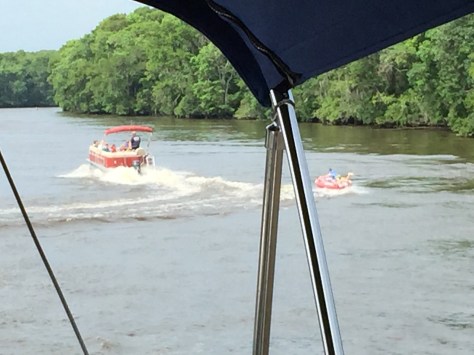 From Georgetown, we successfully made it to Myrtle Beach Yacht Club.  We discovered the Myrtle Beach gnats…those pesty wave runners who jump your waves and add tension to your ride!  Most do not understand boating etiquette let alone safety, as a larger boat is not as quickly maneuvered as their little craft!  But if we ignore them, we do outrun them!  The gnats tend to run in packs…young and old. The scariest are those with 7-8 year olds flopping around in their joy ride!