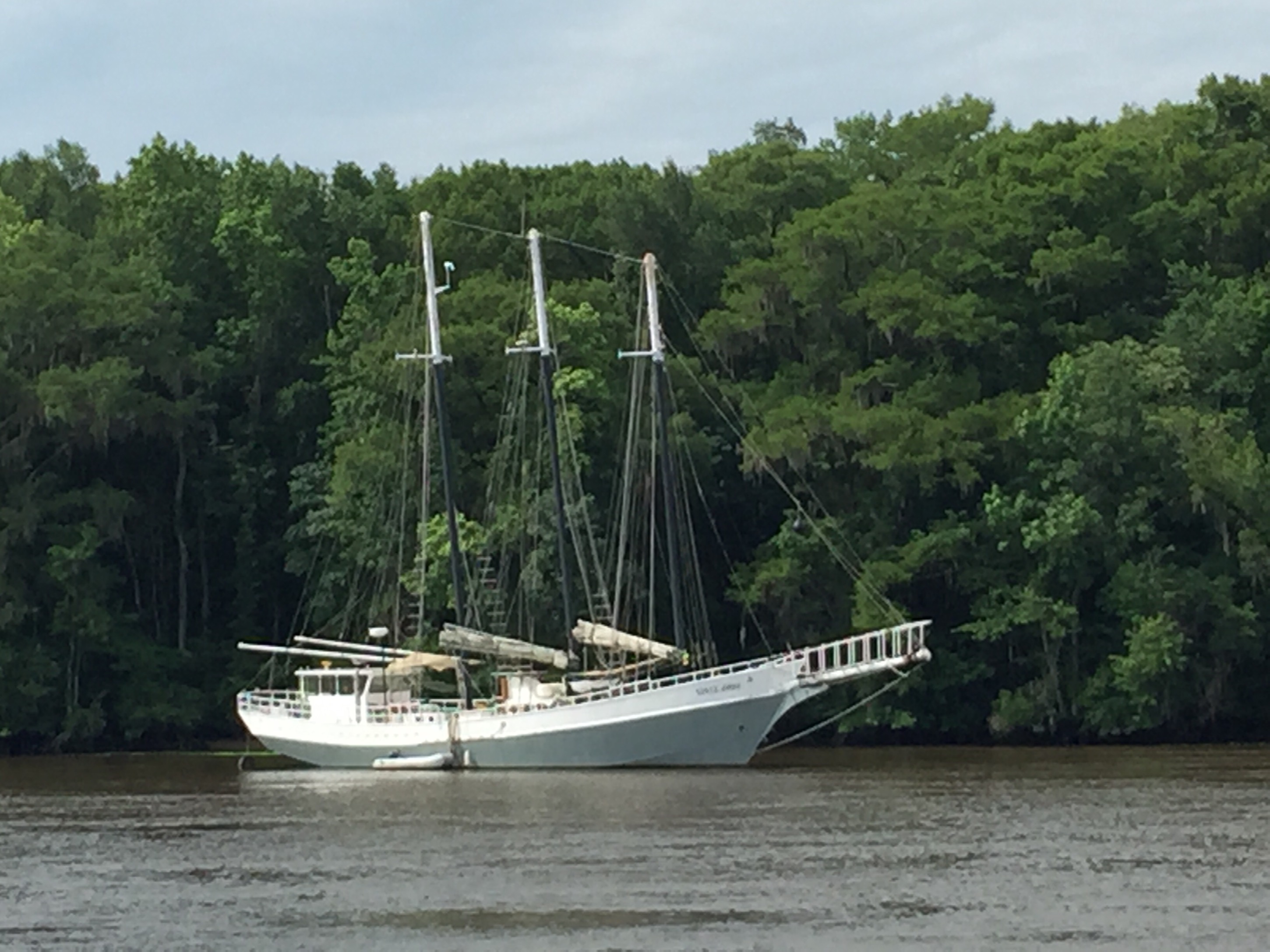 June 12, yesterday, was another great ride day.  The skies were black when we left at 7:35am but only a slight shower ensued.  We caught the 8AM WB bridge opening!  A large storm stayed off shore the entire day so we were blessed again to be able to push forward.  We are OK with pushing this trip, because we have seen so many places we want to explore another time and need to keep our deadline.  Everyday is like sitting under a big beach umbrella watching the beautiful scenery pass by! The ICW is one of our national wonders! Dredging is needed to keep it open especially in Georgia…but this could get political, so I will move on!