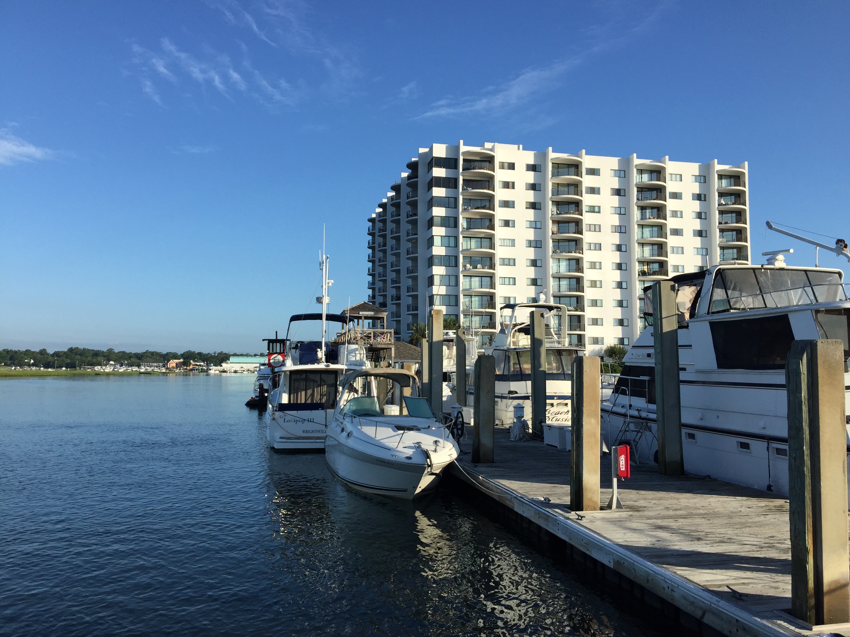We passed under Sunset Beach bridge leading to the beaches of several dear snow birds we have visited!  The day was beautiful and we completed an 80+ mile run to Wrightsville beach,NC!  We stayed at Seapath Yacht Club where our great friends, Kathy and Sandy live.  I added their condo at the docks in photos.  Unfortunately, they were on a trip…but thanks for the goody bag left with the dock master! Yum!  With a courtesy car there, we could provision up and drive to restaurants.  A GREAT stopping place!